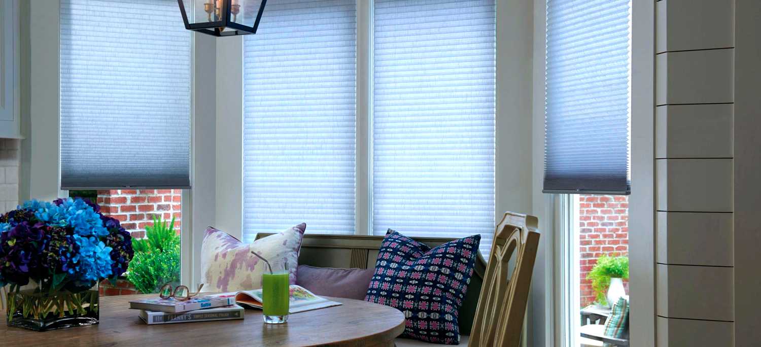 - Также для первого этажа подойдут шторы-плиссе. Они настолько универсальны, что могут применяться даже для окон с нестандартной конфигурацией. Такие системы хорошо защищают от яркого солнечного света, а также позволяют открывать окно полностью или частично, сверху или снизу, а также позволяют совмещать два вида тканей на одном окне.