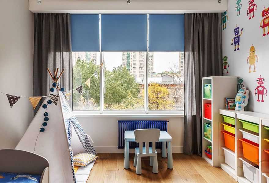 - Рулонные шторы + тюль, перекрывающий весь оконный проем. При необходимости его можно будет сдвинуть в одну или разные стороны, чтобы открыть окно и обеспечить беспрепятственное освещение комнаты.