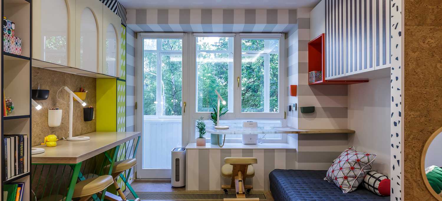 Для проекта «Капсульная детская для трех сестер» была выбрана комбинация солнцезащитных систем, обеспечивающих защиту от солнца, приватность и выполняющих декоративные функции оформления окна: