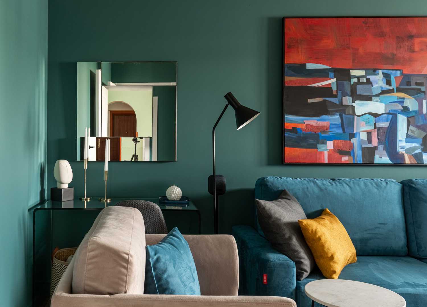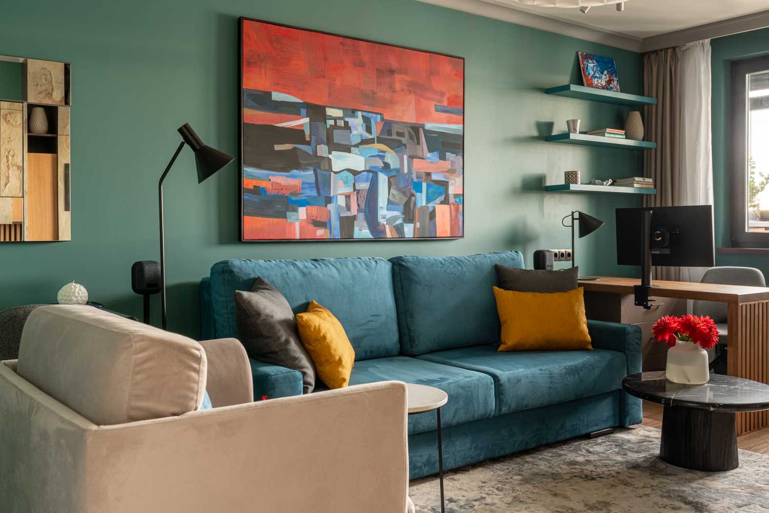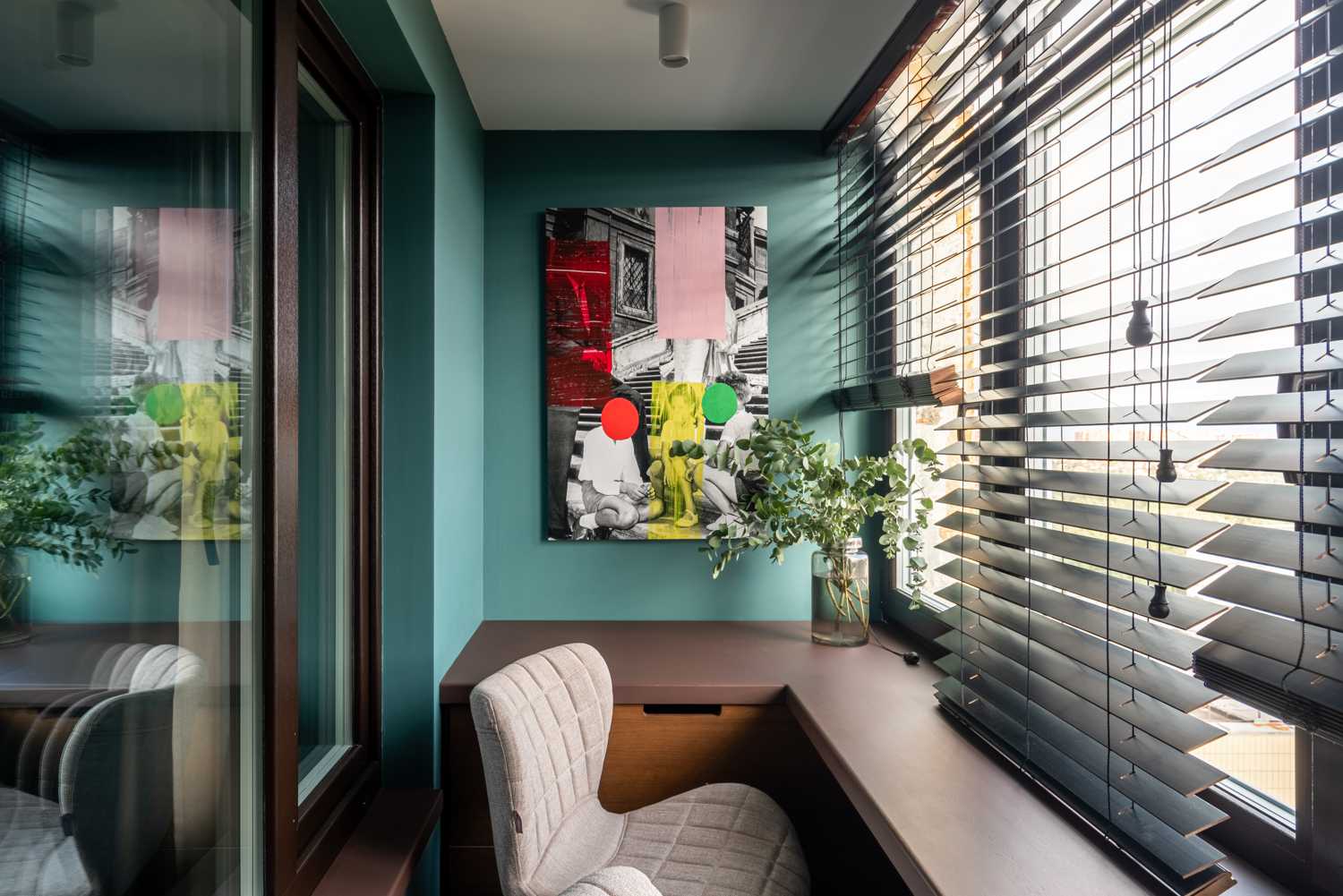 Вдохновением для интерьера нового выпуска программы «Квартирный вопрос» стало озеро Байкал. Именно поэтому отправной точкой в цветовом решении стала его природа и ее оттенки. Стены выкрашены в сине-зеленую краску, для пола подобрана паркетная доска благородного натурального цвета. Насыщенный синий диван, кресло в нейтральном бежевом цвете, продуманный сценарий освещения – все это вкупе складывается в единое пространство, напоминающее героям программы о своем путешествии на Байкал. В поддержку темы натуральных цветов и материалов на окна установлены горизонтальные деревянные жалюзи Первое - это деревянные горизонтальные жалюзи с ламелями из натурального дерева в цвете Венге. Благородство натуральных материалов, стильный темный цвет и ширина ламелей 50 мм придают изделиям особый вид. Жалюзи прекрасно смотрятся на окне, дополняя интерьер, а управление естественным светом благодаря данному виду солнцезащиты простое и удобное. В данном проекте предусмотрены жалюзи с ручным управлением. Второе - для классических штор был установлен моторизованный шторный карниз AMIGO, позволяющий дистанционно управлять полотнами штор при помощи эргономичных пультов или кнопок управления. Кстати, благодаря современным решениям по моторизации управлять шторами и жалюзи можно благодаря мобильному приложению AMIGO Connect и даже при помощи голосового помощника Siri.