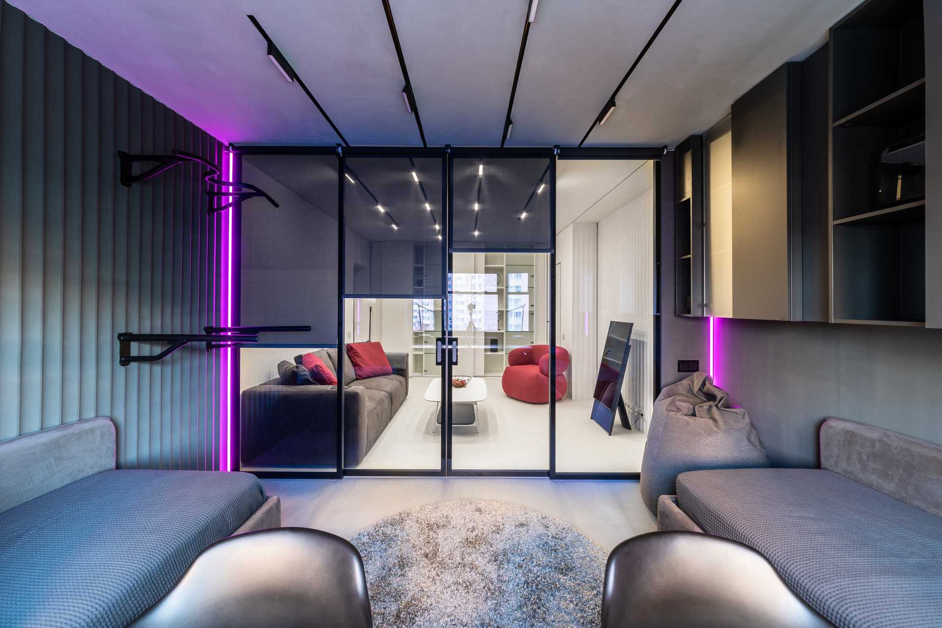 Когда площадь ограничена, а функциональных зон должно быть много, на помощь приходит дизайнерский ум! В данном проекте, мозгом операции выступил дизайнер Михаил Новинский. Ему удалось не только правильно спланировать зону детской и гостиной, но и оригинально оформить интерьер.