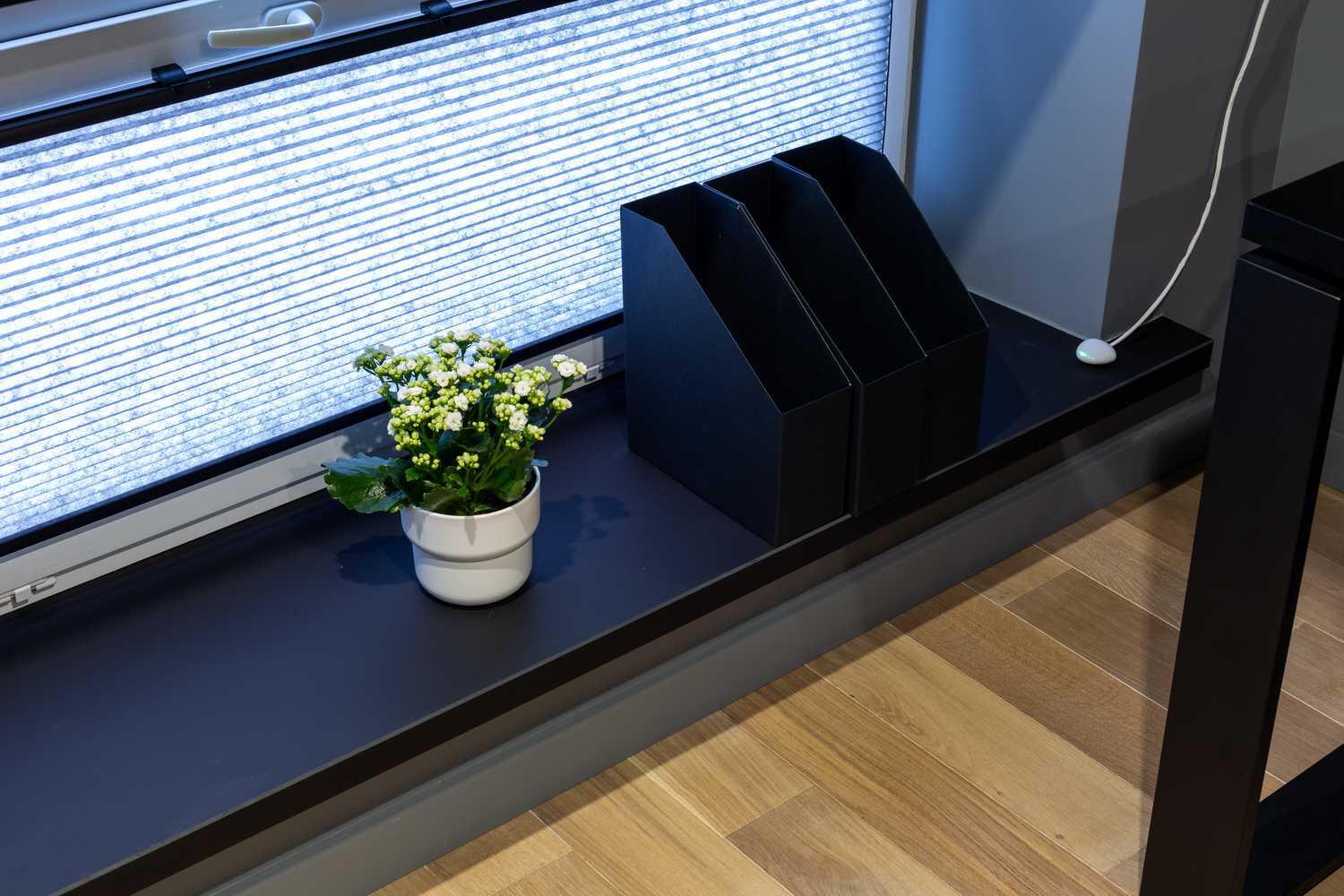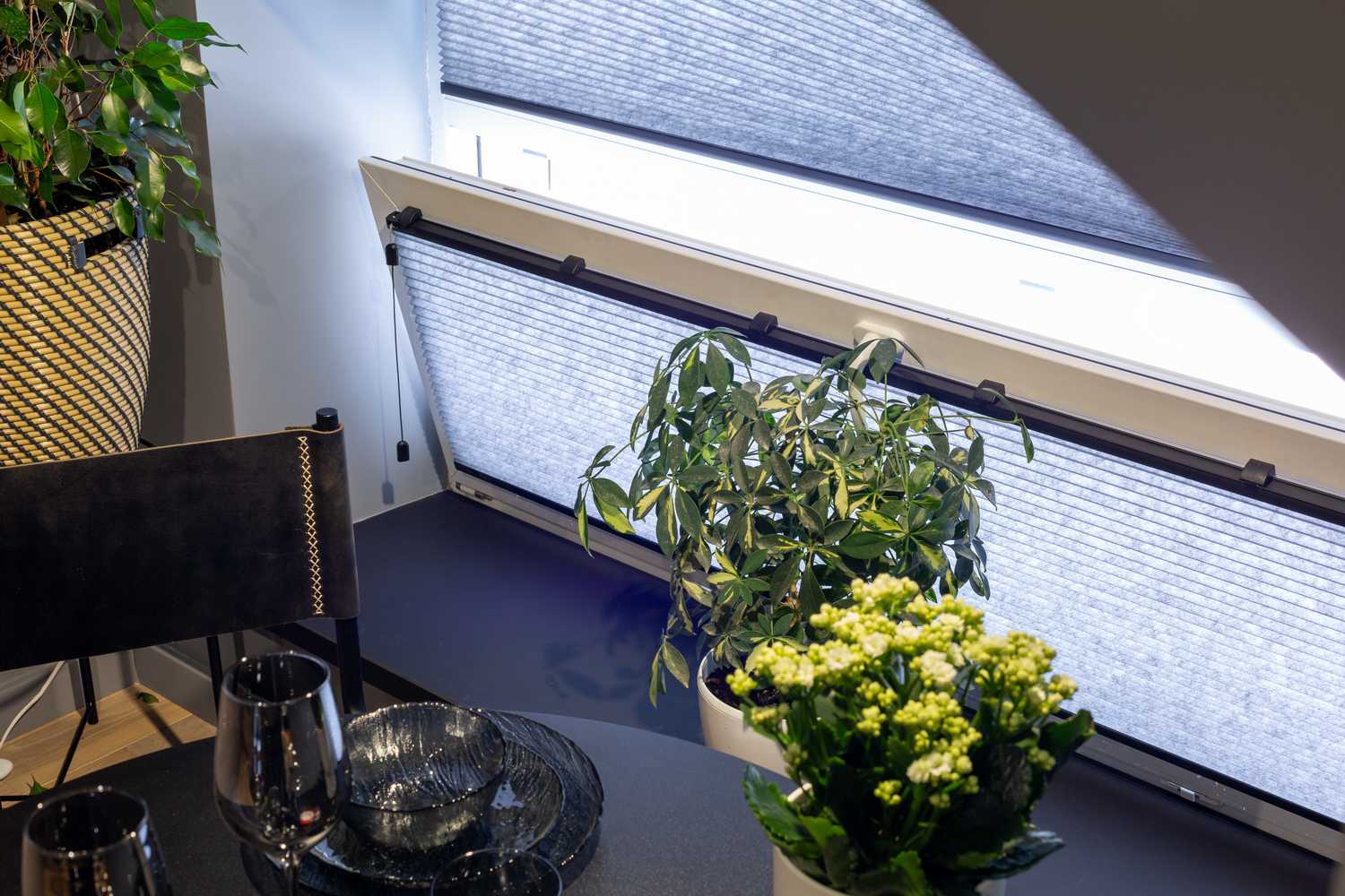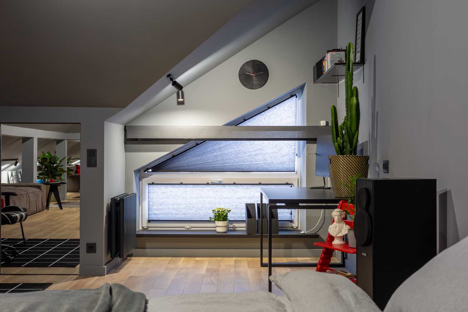 1. Шторы гофре от компании AMIGO, установленные на сами рамы окон, в том числе на треугольные окна. Данный вид солнцезащиты позволяет решить все необходимые функциональные задачи: обеспечить приватность и защитить помещение от излишнего солнечного света. Кроме этого, оригинальная сотовая структура полотна гофре позволяет сокращать теплопотери по всей площади окна и обладает звукоизоляционными свойствами. Фурнитура для штор выбрана черного цвета. Она идеально сочетается с материалом самих штор – тканью ГОФРЕ САТИН темно-серого цвета.