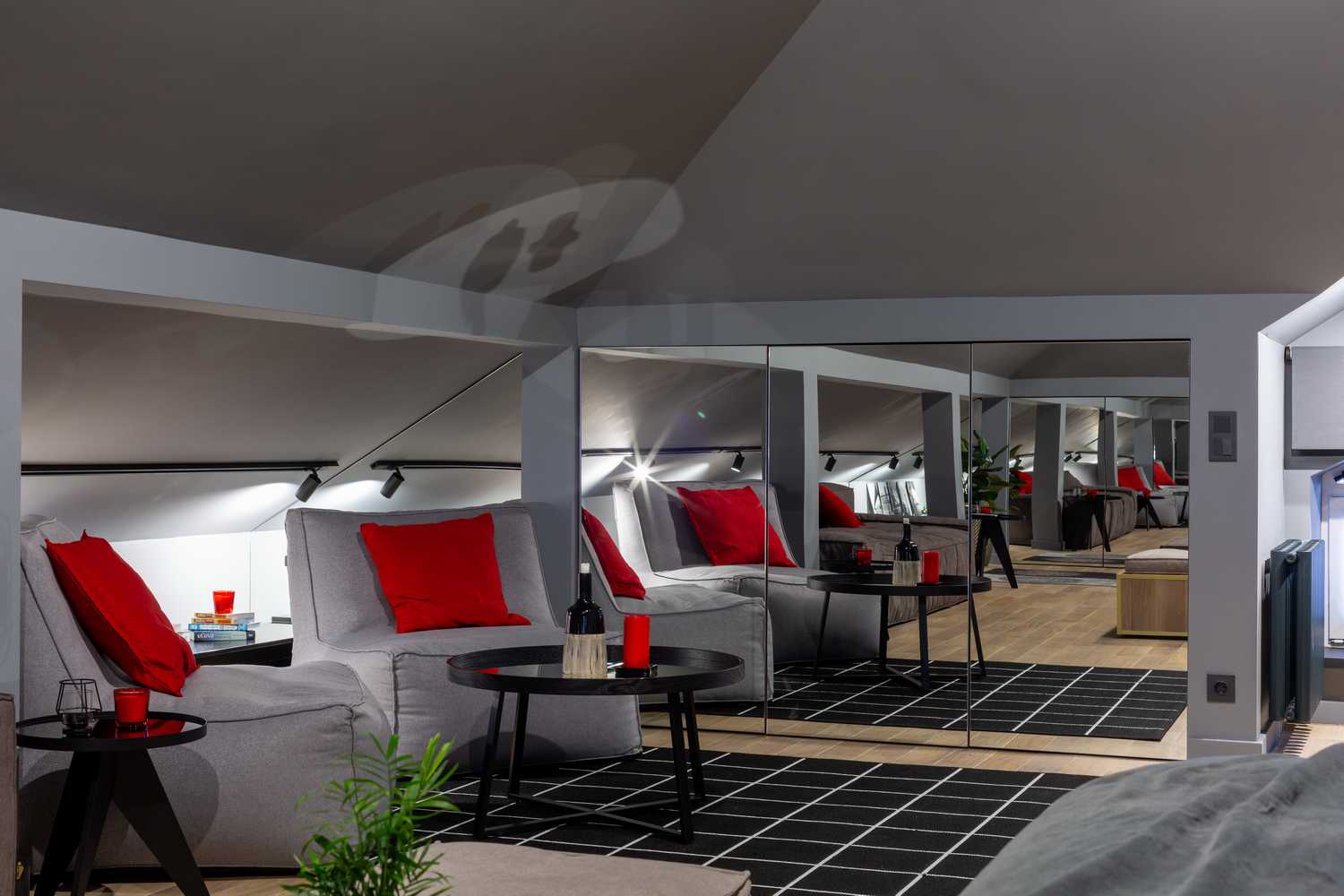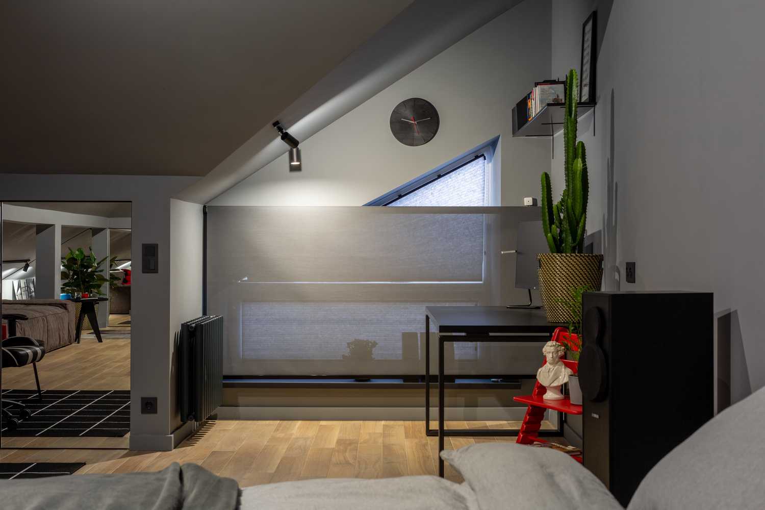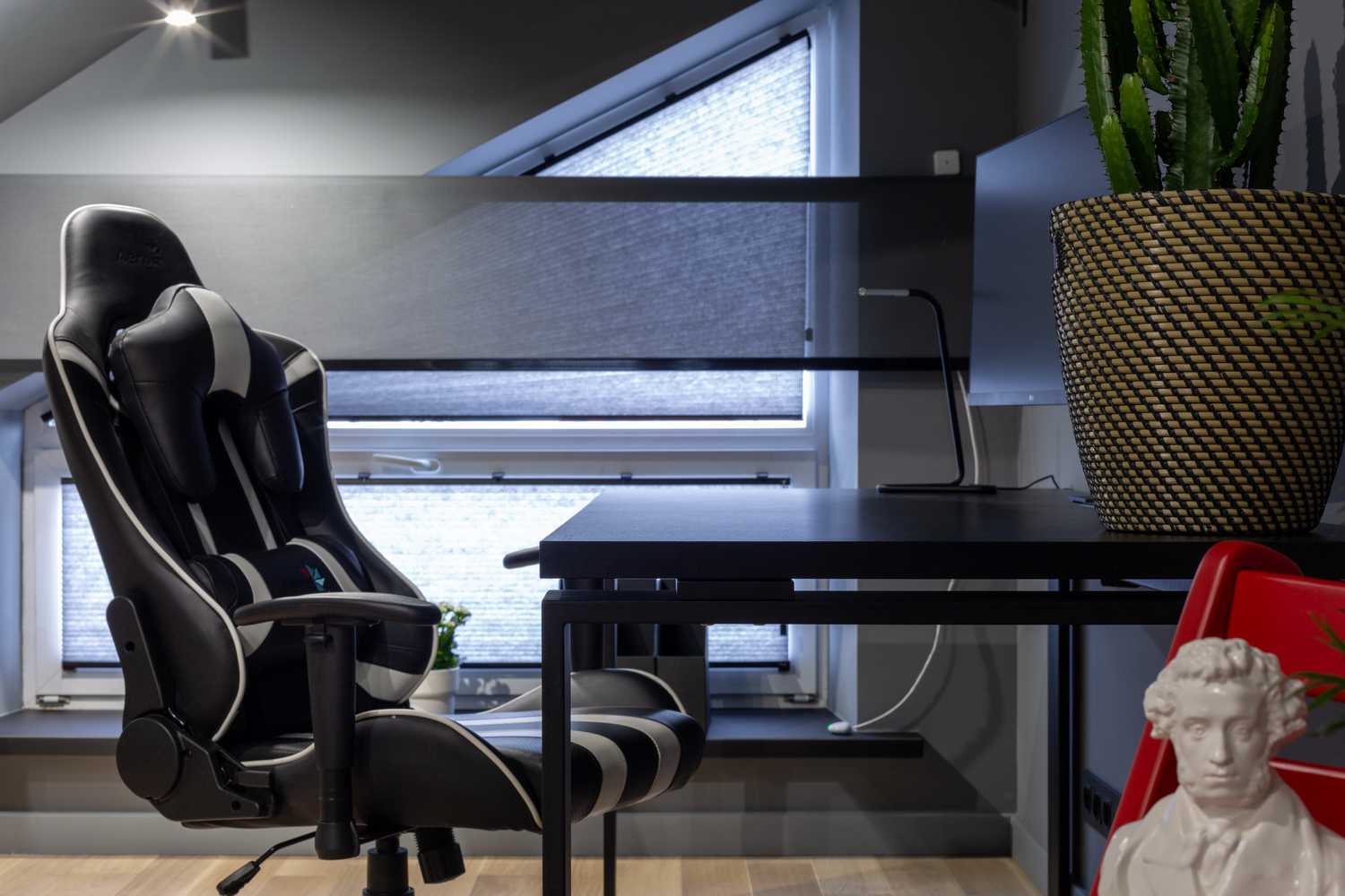 1. Шторы гофре от компании AMIGO, установленные на сами рамы окон, в том числе на треугольные окна. Данный вид солнцезащиты позволяет решить все необходимые функциональные задачи: обеспечить приватность и защитить помещение от излишнего солнечного света. Кроме этого, оригинальная сотовая структура полотна гофре позволяет сокращать теплопотери по всей площади окна и обладает звукоизоляционными свойствами. Фурнитура для штор выбрана черного цвета. Она идеально сочетается с материалом самих штор – тканью ГОФРЕ САТИН темно-серого цвета.