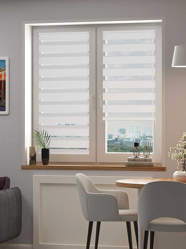 Рулонная штора зебра FixLine BASIC белого цвета - это удобная и практичная штора для декора окон и защиты от солнца. Материал обладает высокими прочностными характеристиками, не выгорает