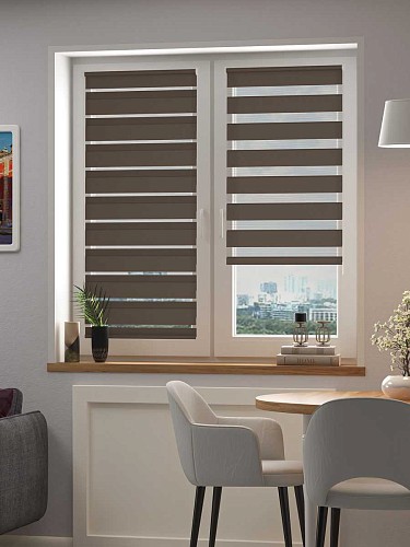 Рулонная штора зебра FixLine BASIC коричневого цвета - это удобная и практичная штора для декора окон и защиты от солнца. Материал обладает высокими прочностными характеристиками, не выгорает