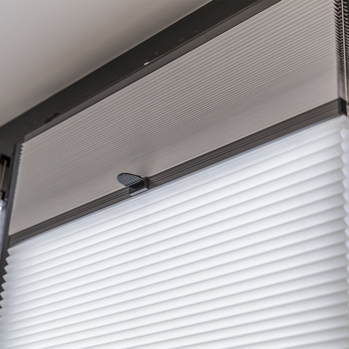 Они используются для потолочных окон или остеклённых конструкций с предусмотренным углом наклона от 45 до 90 градусов. Для управления шторой используется ручка, установленная на подвижный карниз.